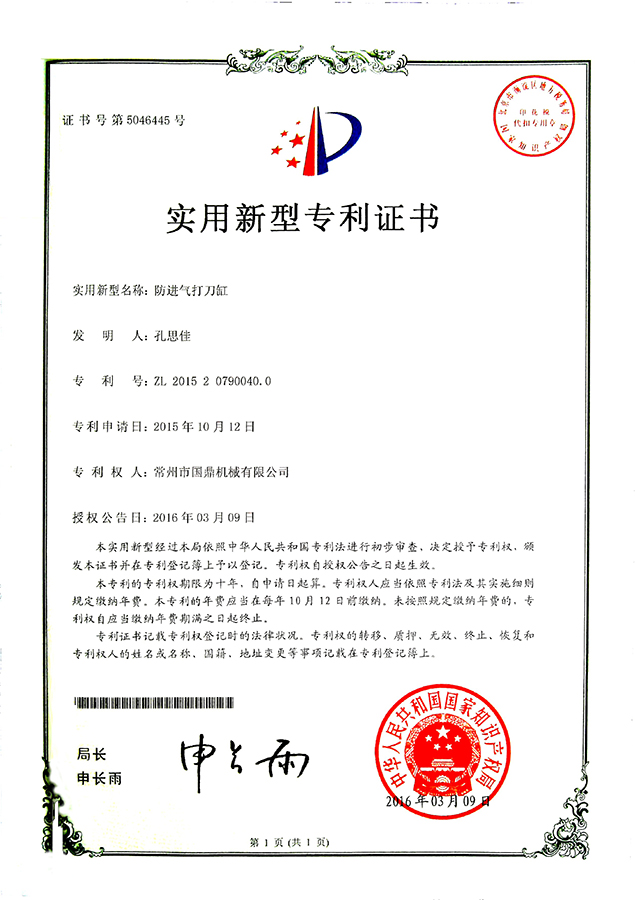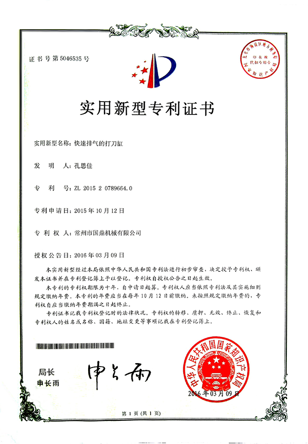 • 《快速排氣的打刀缸》專(zhuān)利證書(shū)