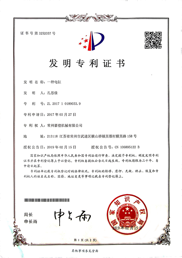 • 《一種電缸》發(fā)明專(zhuān)利證書(shū)